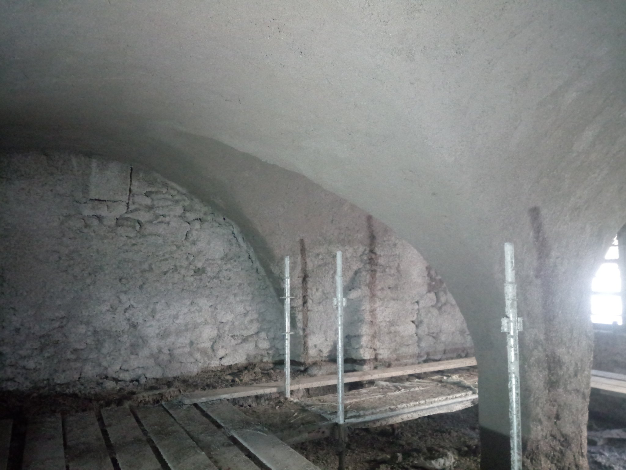 Enfin, la souplesse d’utilisation d’un enduit permet éventuellement d’isoler des voûtes quand cet enduit est isolant ! Pour cela, le mieux est évidemment que la maison au-dessus soit déjà isolée, si possible par l’extérieur et avec un complexe isolant descendant suffisamment bas sur les murs de la cave voûtée. L’enduit sur voûtes permet alors à la fois d’assainir celles-ci (décroûtage, gobetis puis enduit isolant) et d’améliorer l’isolation du logement au-dessus ; voire d’aménager un espace habitable dans les voûtes elles-mêmes.